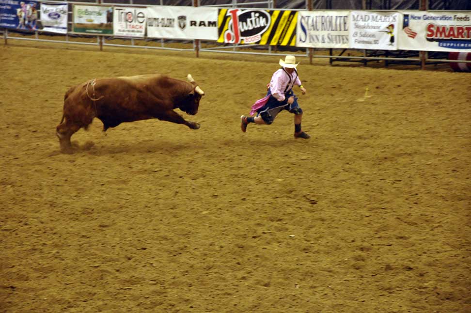 I'm not sure who has the more dangerous job, the bull riders or the clowns. Nice action shots.