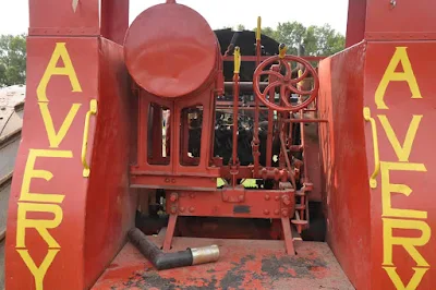 This 1920 Avery 25-50 built in Peoria, Illinois is called that because it produced 25 horsepower at the draw bar and 50 horsepower at the belt pulley. These "oil pulls," so called because they burned kerosene, were often used to power belts that ran thrashing machines and saw mills, but they also pulled implements in farm fields. While the horsepower numbers are not impressive, these machines produced large amounts of torque to pull six plow bottoms through tough soils. The motor is four cylinder, horizontal opposed, valve in head, with a bore of 6.5 inches and stroke of 8 inches. It was designed to run at 700 RPM. In low gear it went two miles per hour and in high gear it goes three miles per hour. Depending on how hard the tractor is working, it burns between five and seven gallons of kerosene per hour so with its fifty gallon fuel tank it could work eight to ten hours. This tractor weighs 12,500 pounds. The Avery Machine Tool Company went out of business in 1924 because farmers were looking for smaller, lighter, cheaper tractors which could be operated by a single individual.